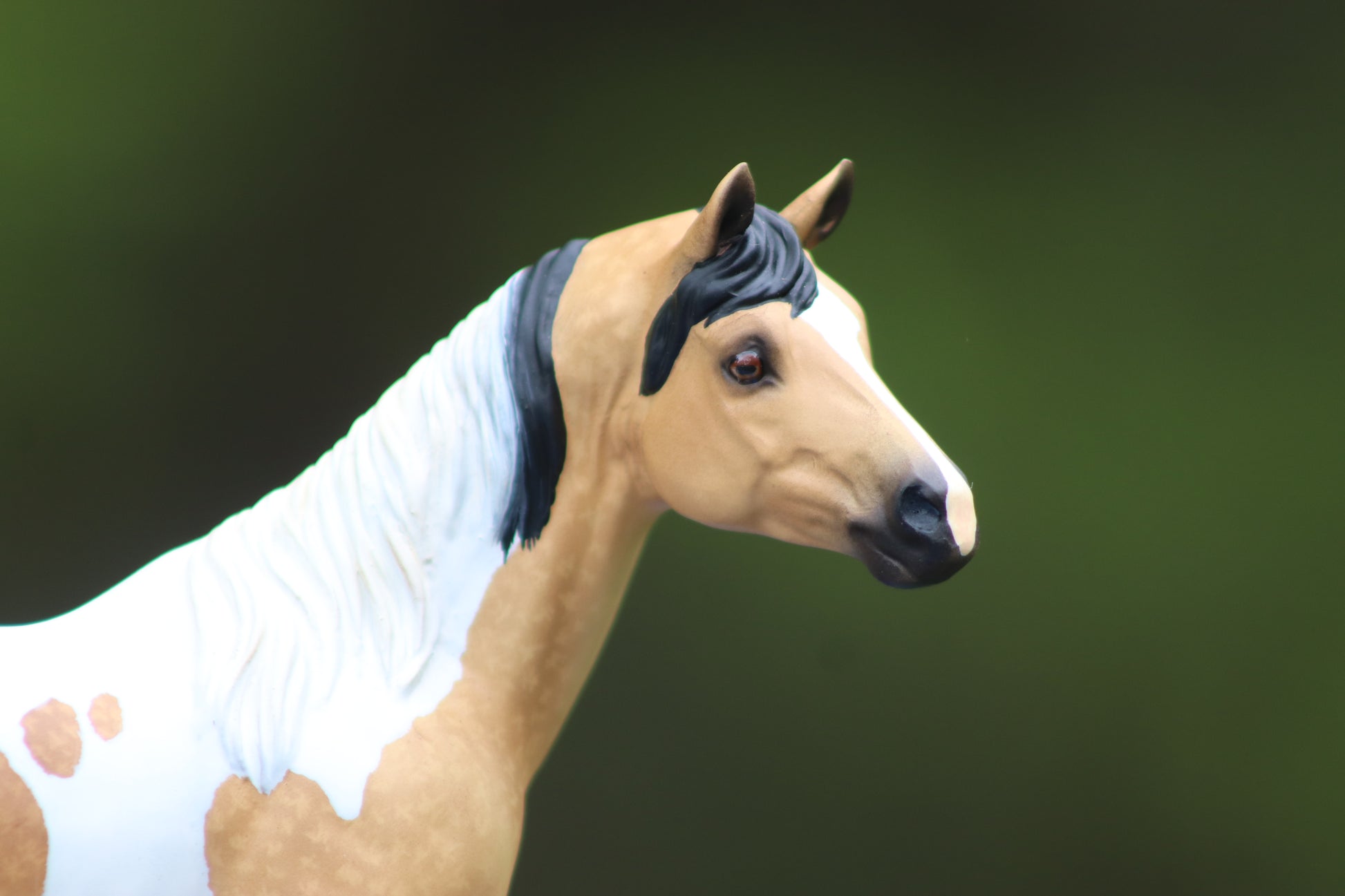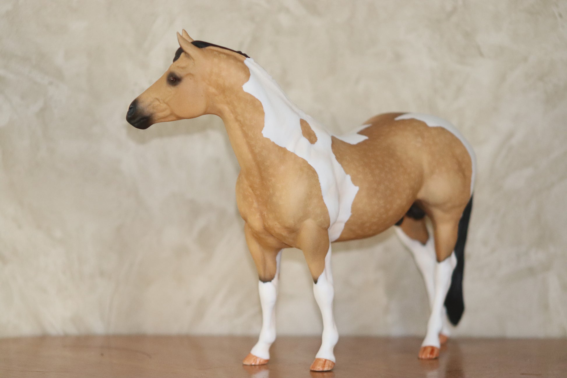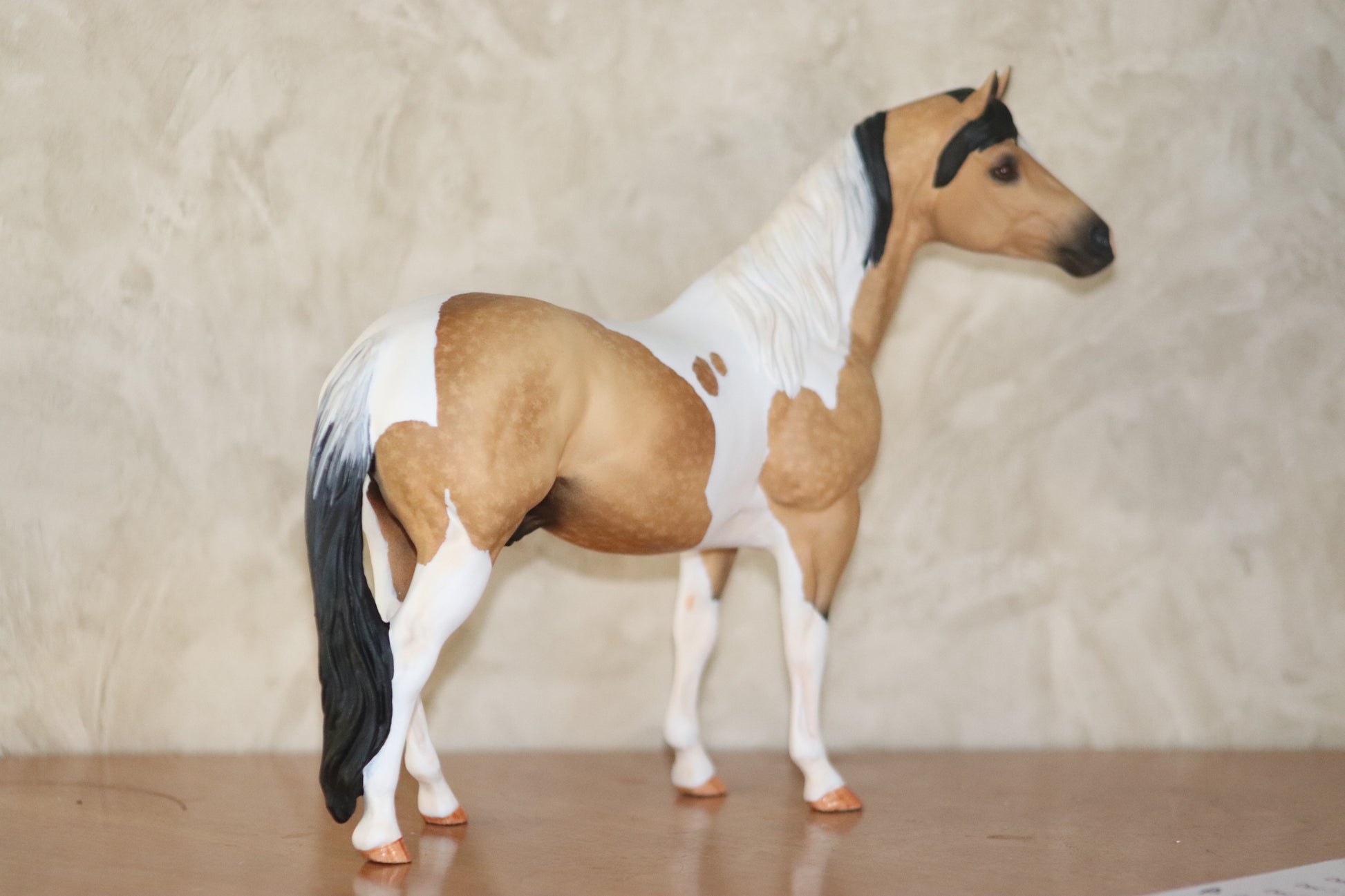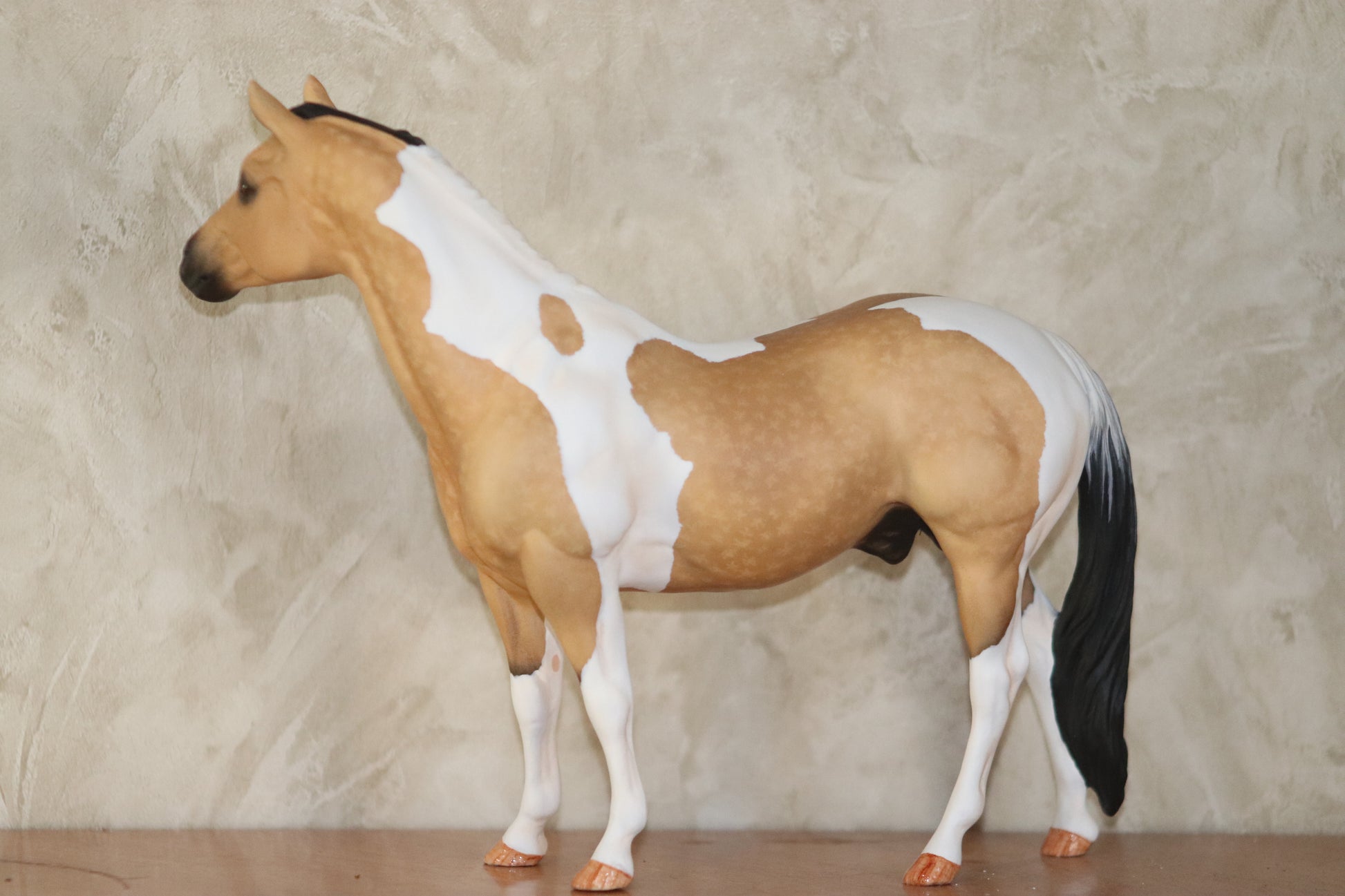 Custom Classic Quarter Horse Stallion. This guy got a beautiful new mane and tail. He also has re-sculpted stallion anatomy and ears. He is painted a stunning dappled buckskin tobiano. He has glossed eyes, nostrils, and hooves. If you love the Maureen Love classics, you'll LOVE this guy. He is live show proven and will come with his 3rd place ribbon!