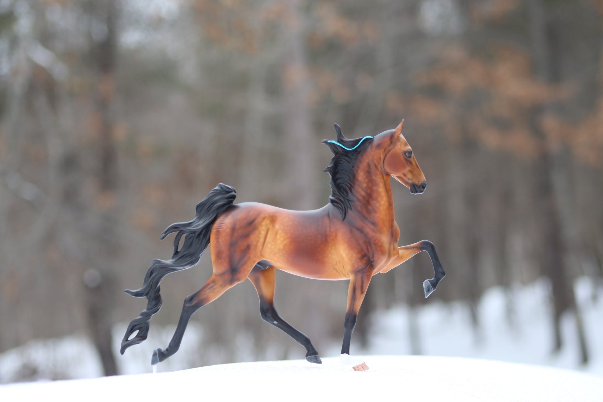 Beautiful Marc of Charm custom. He is painted a rich bay with dapples and lots of shading. His mane and tail have subtle shading too. His eyes and hooves are glossed. He has a clear peg inserted in each hind hoof, this gives him a nice suspended look and makes him a little less tippy.