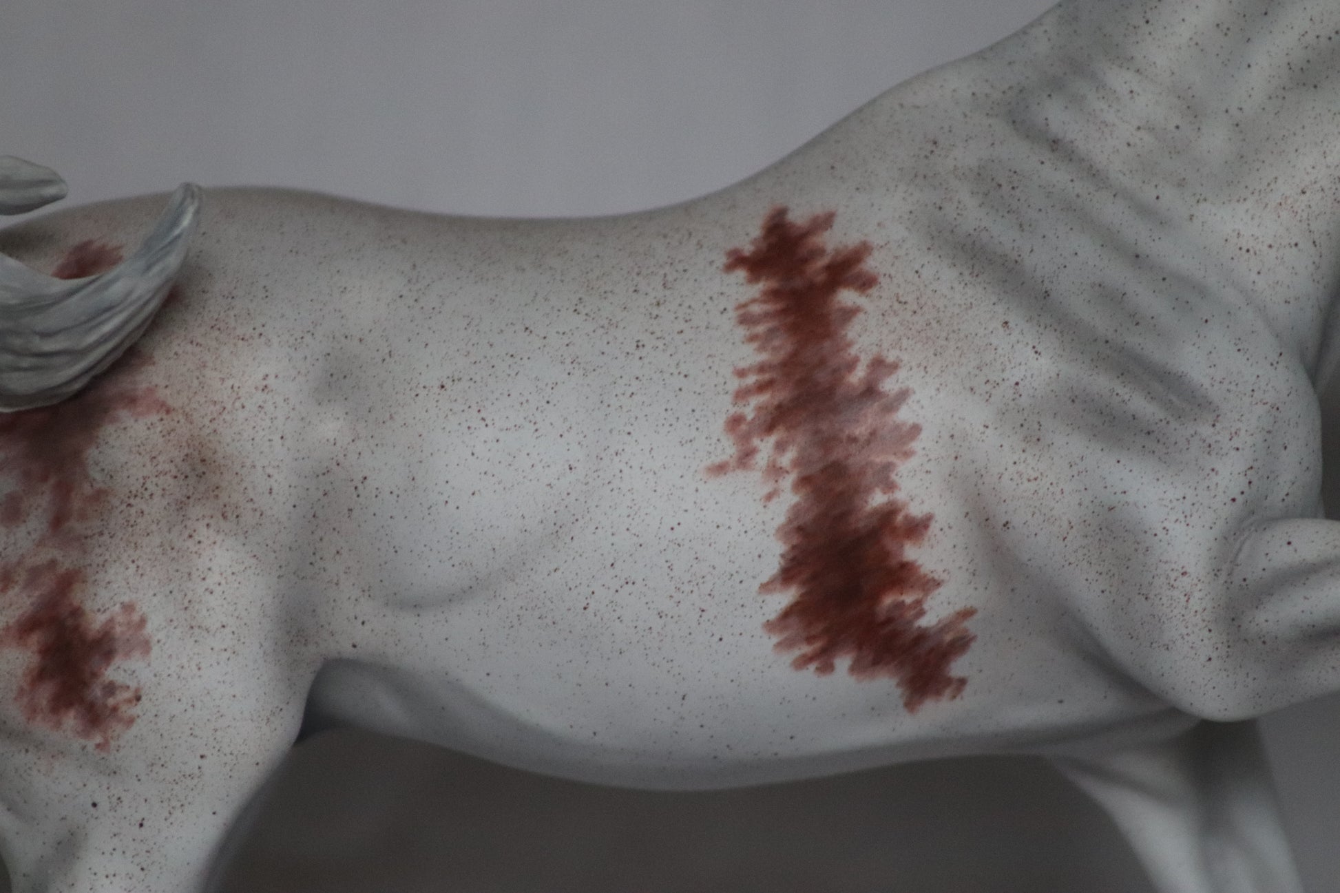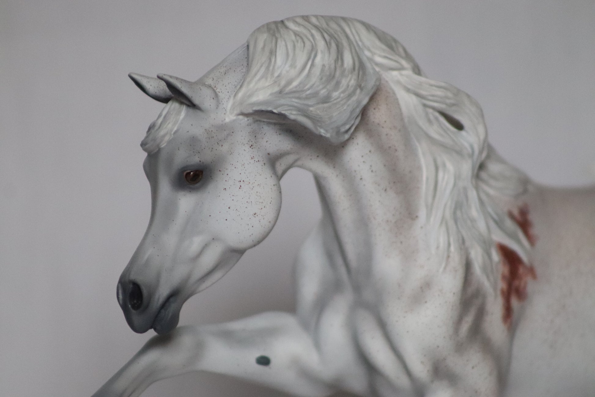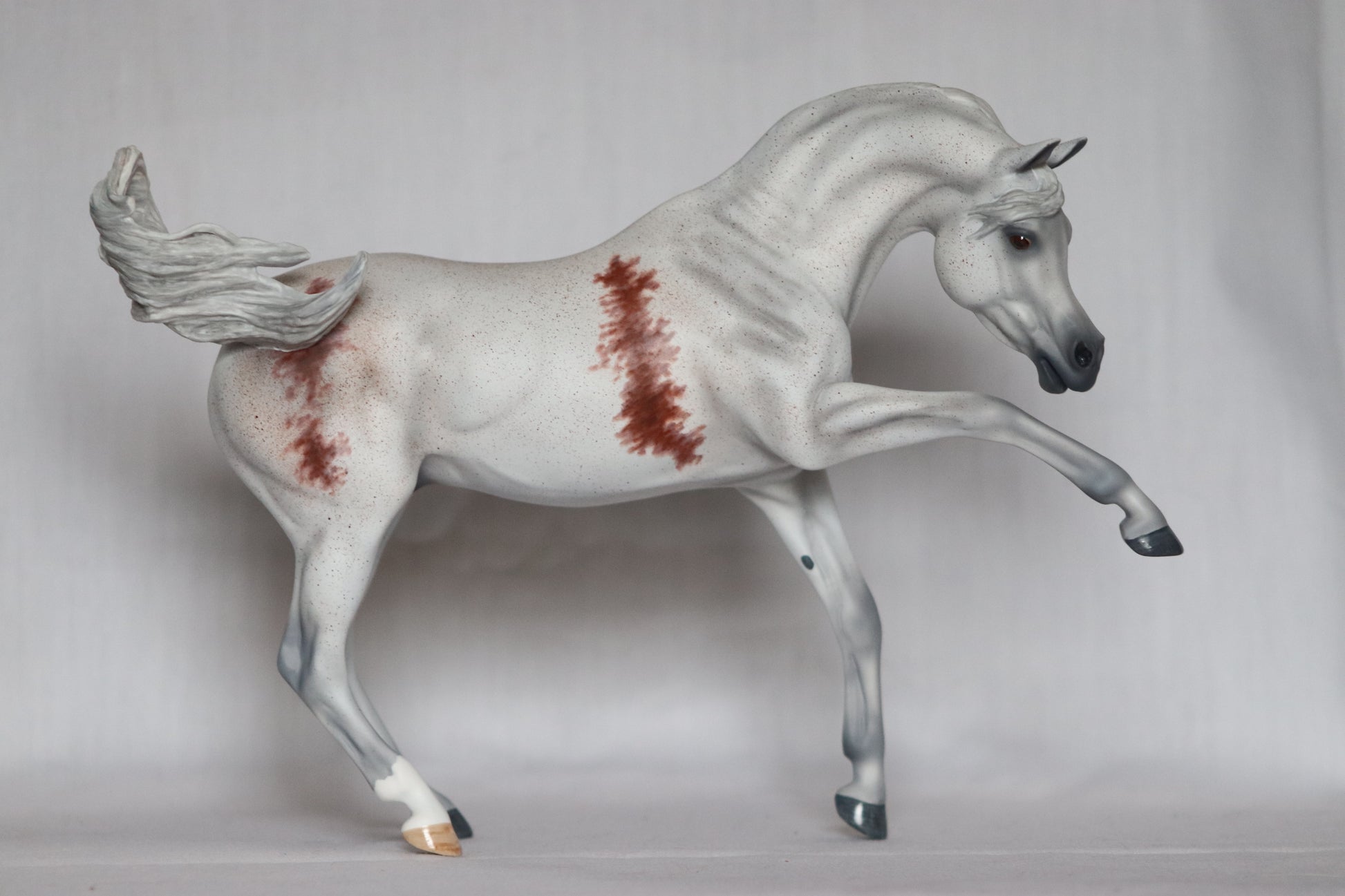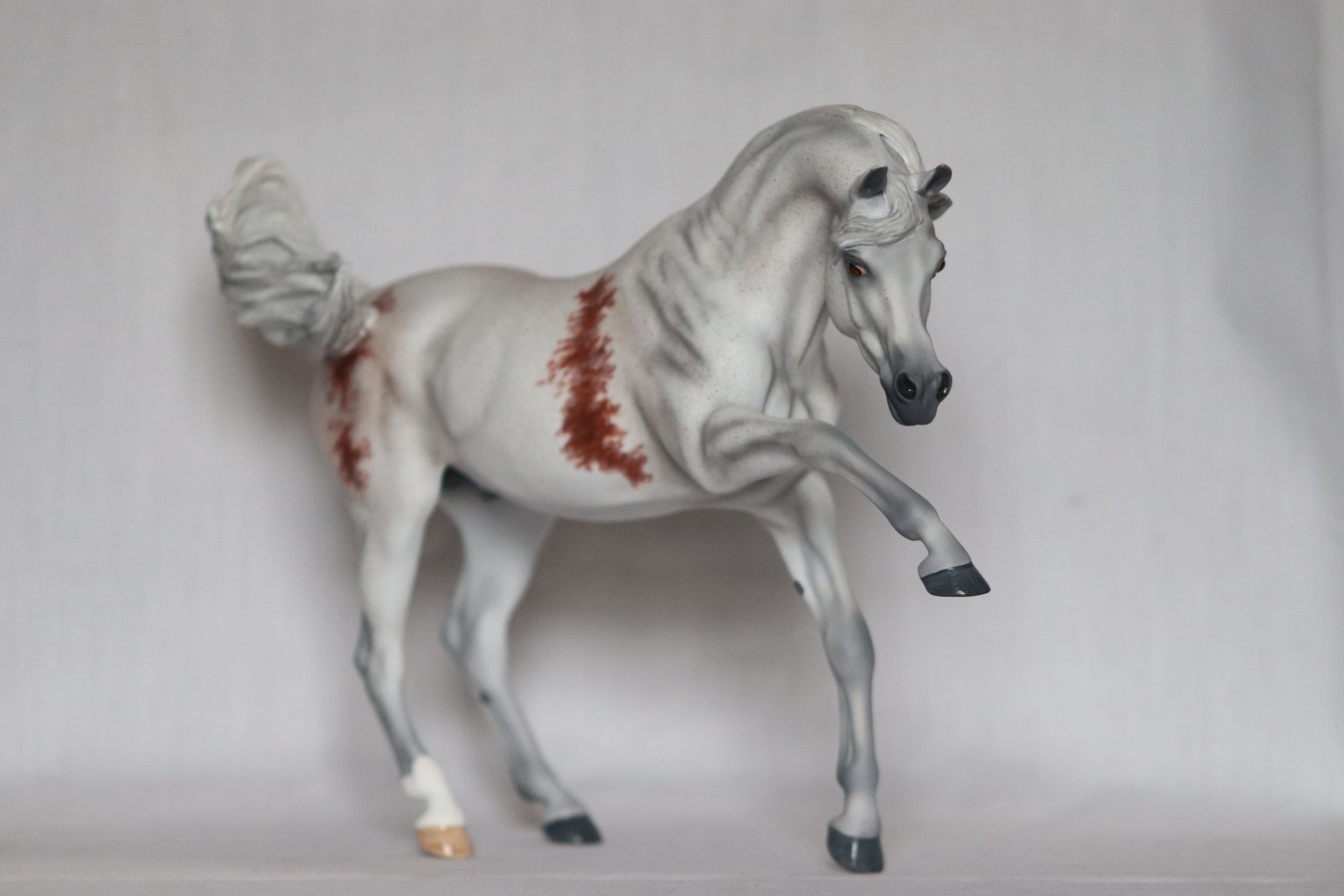 Custom Traditional Scale Breyer Ashquar. This guy is painted a shaded light grey with lots of tiny flea bites and "bloody shoulder" markings that are often seen on Arabians. He has a shaded mane and tail. His eyes, nostrils, and hooves have been glossed. He is live show proven and won 4th in his Arabian class!