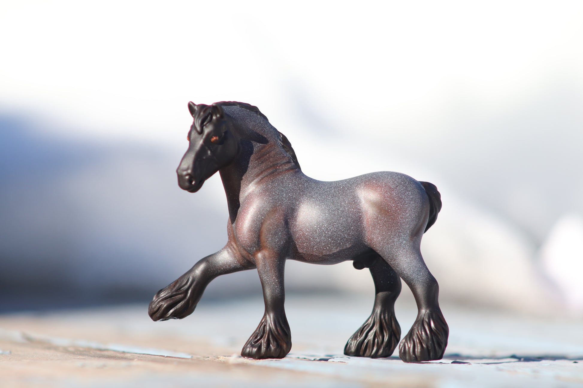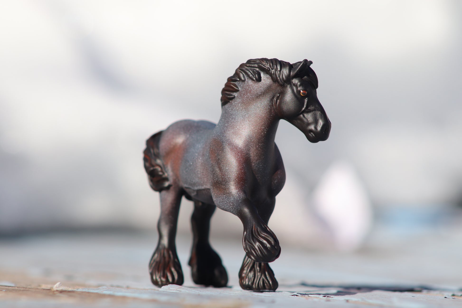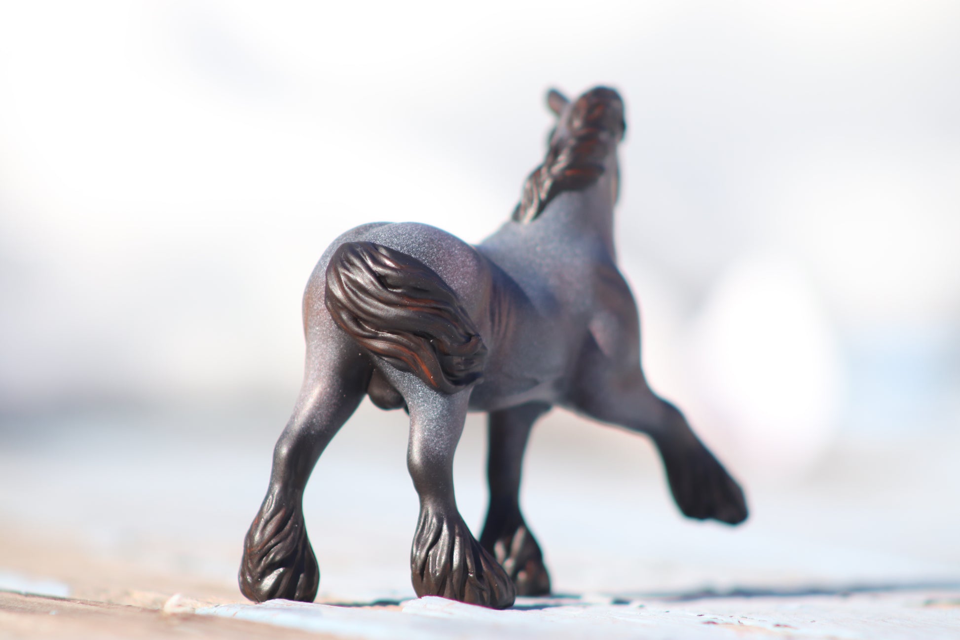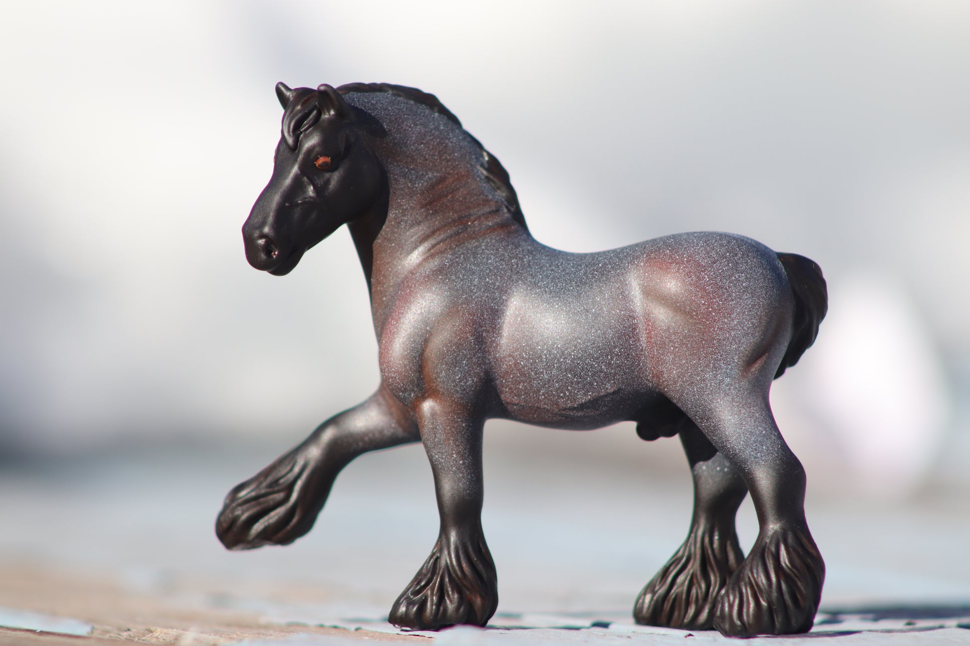 Custom stablemate Darley with a G1 Thoroughbred mare head and neck. She has a new mane and tail and is painted a stunning shaded black. Her eyes, nostrils, and hooves have been glossed. As with all my customs her logo and seams have been removed. I don’t guarantee LSQ, but would not hesitate to show her.