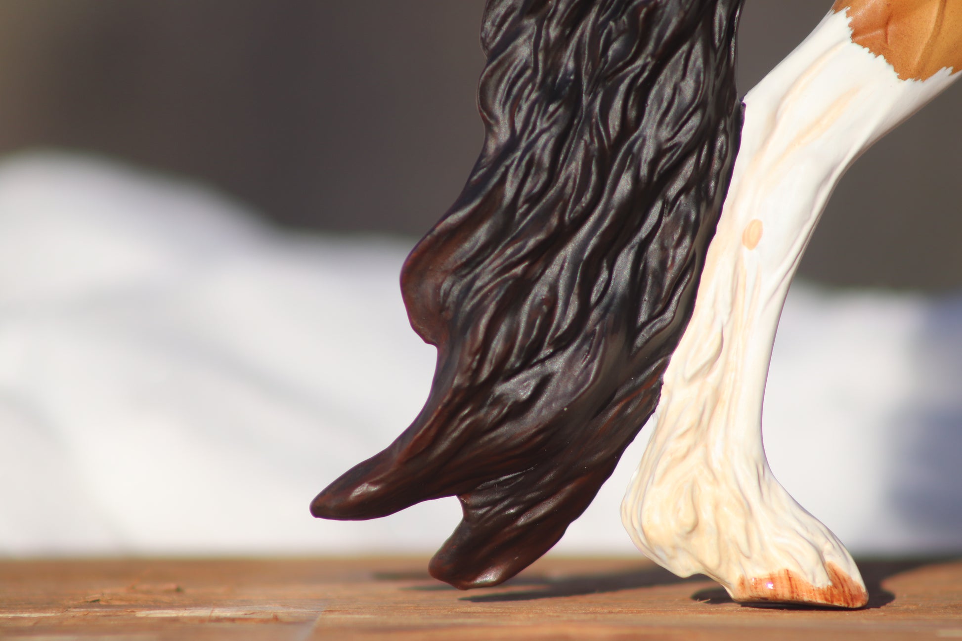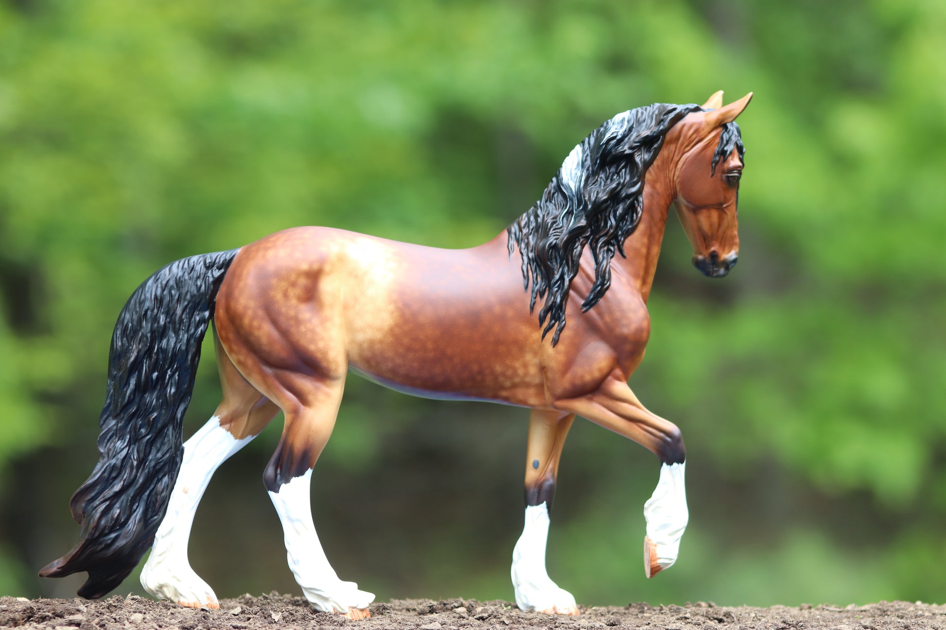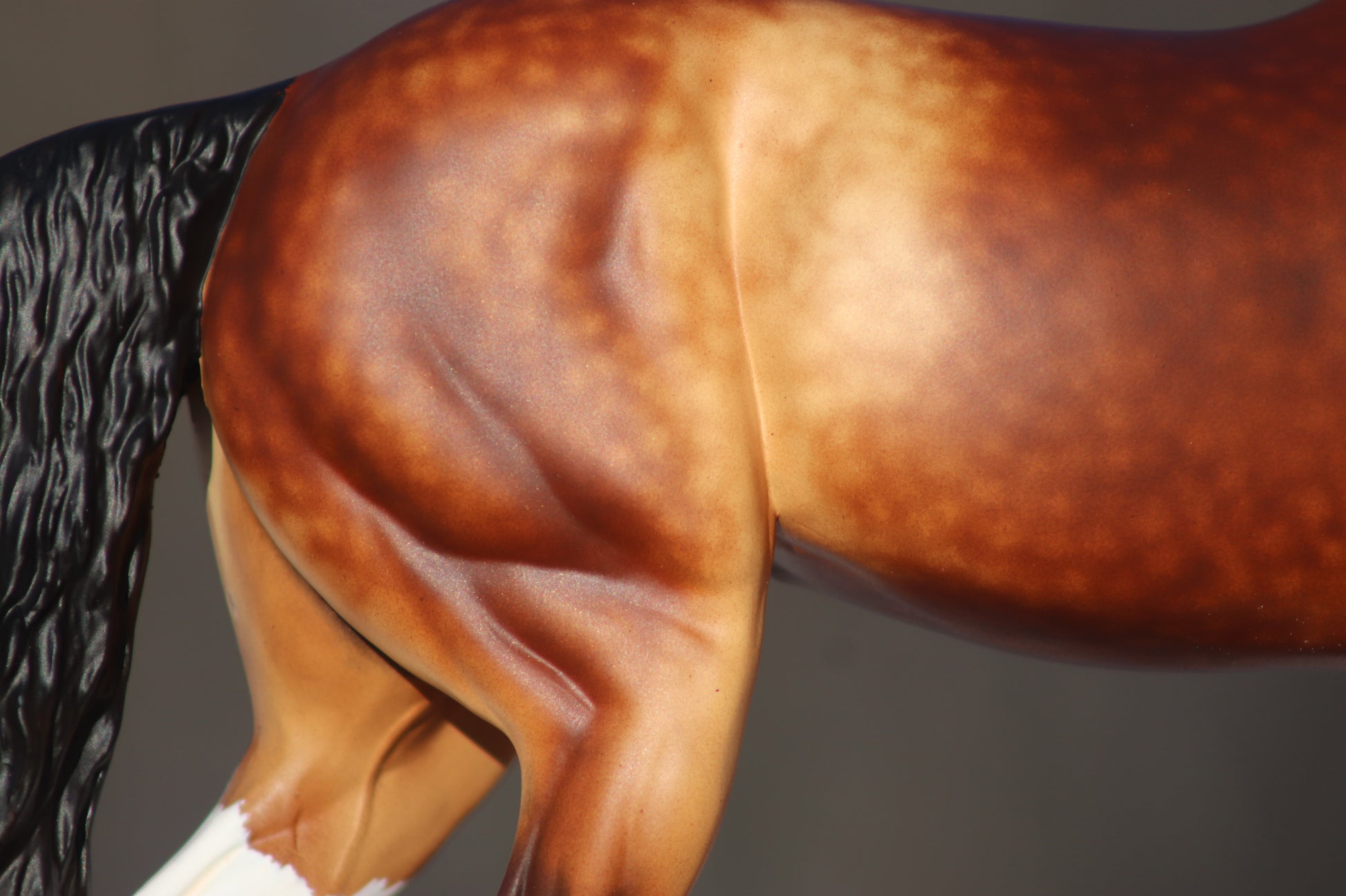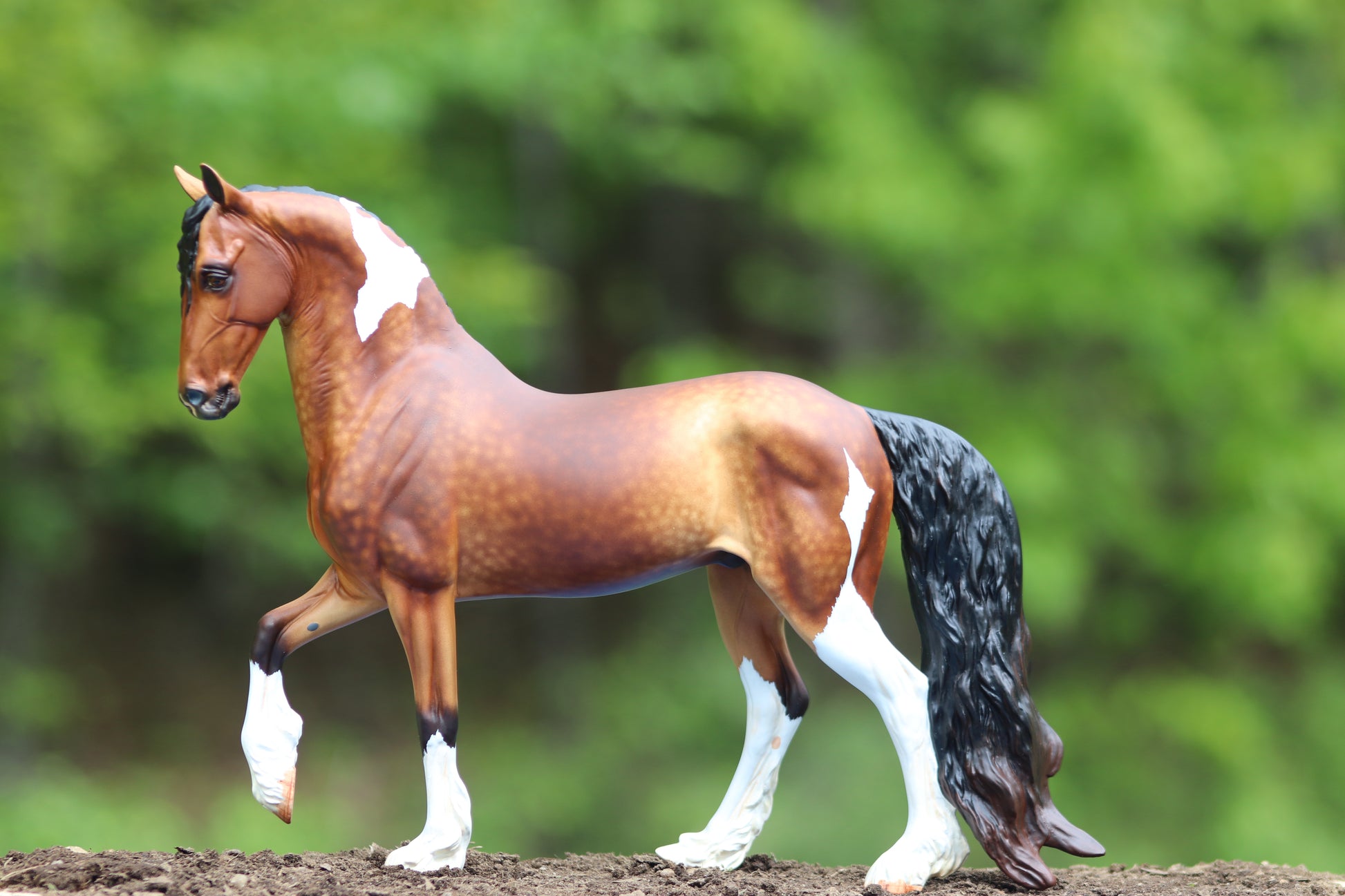 Gorgeous custom Traditional scale Vermeer! He is painted my signature dappled sooty buckskin that gets many compliments! His coat has a very subtle metallic sheen and lots of shading. He has striking minimal tobiano markings too. Even his white markings have loads of shading. His hooves are highly detailed. His hooves do not sit completely flat, his legs are NOT bent and he stands well despite this. His eyes, nostrils, and hooves are glossed. This guy is now live show proven!! He won 3rd place in workmanship in a huge Sport Breed Class! He was so close to NAN qualifying!