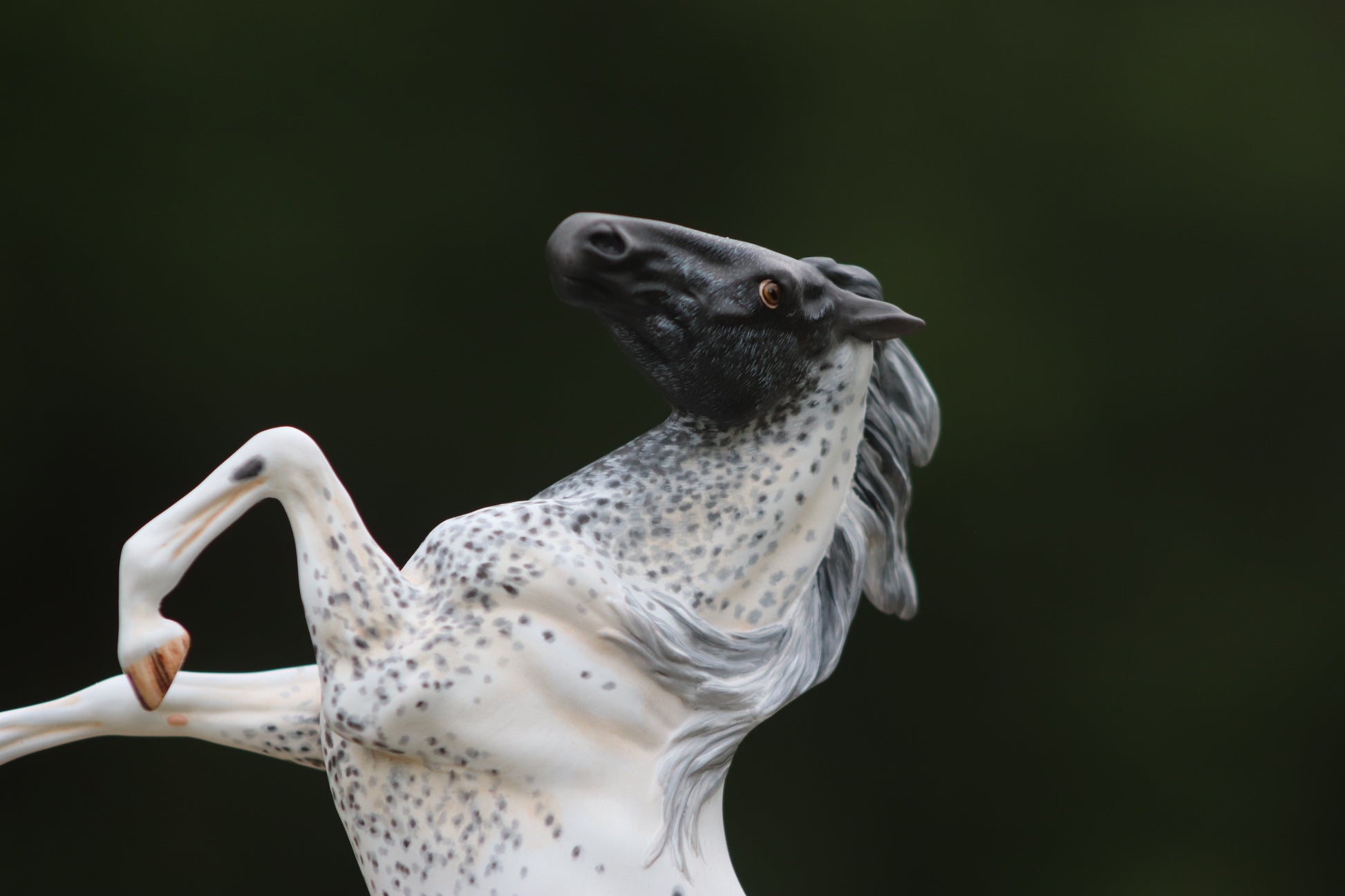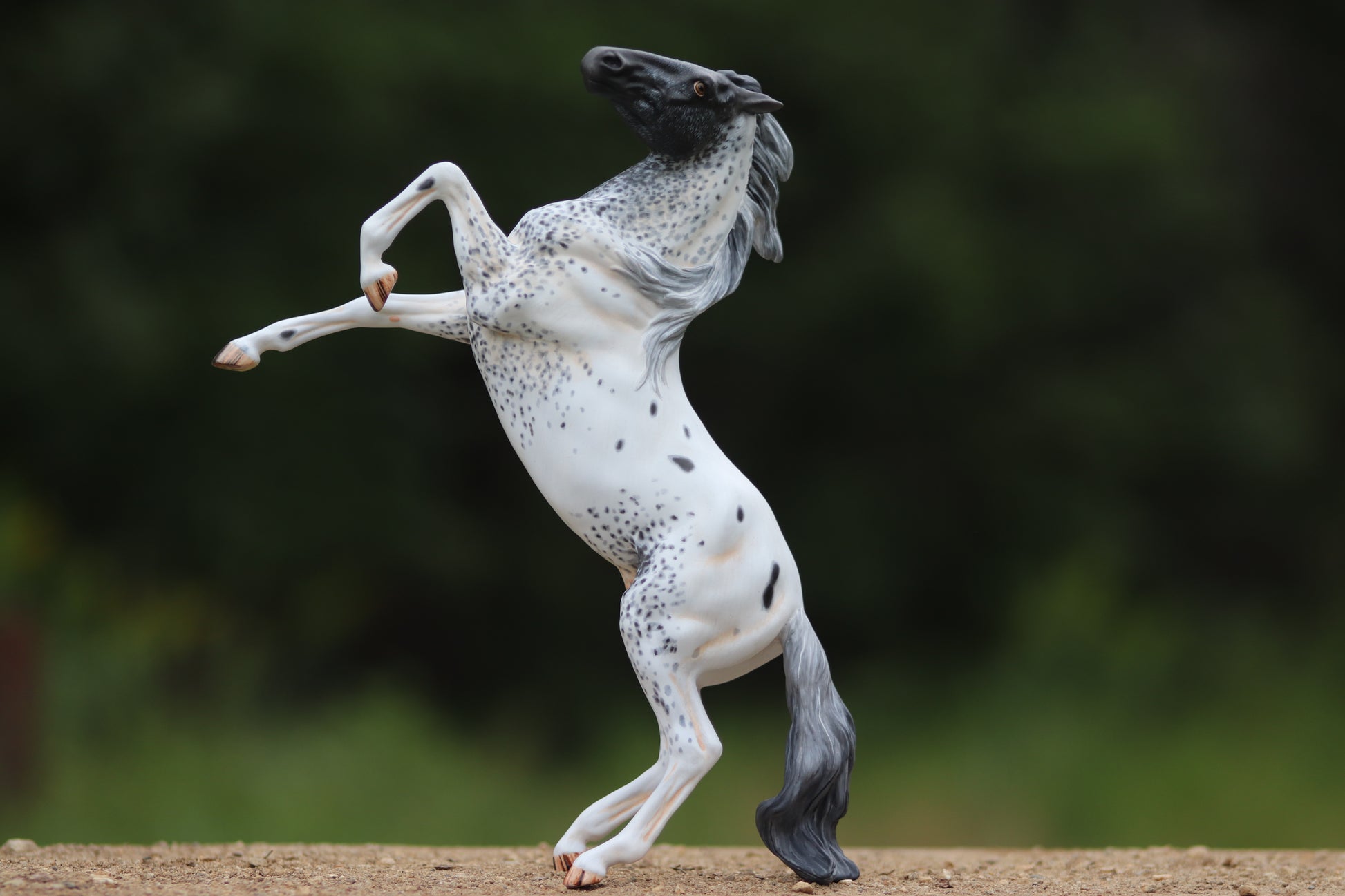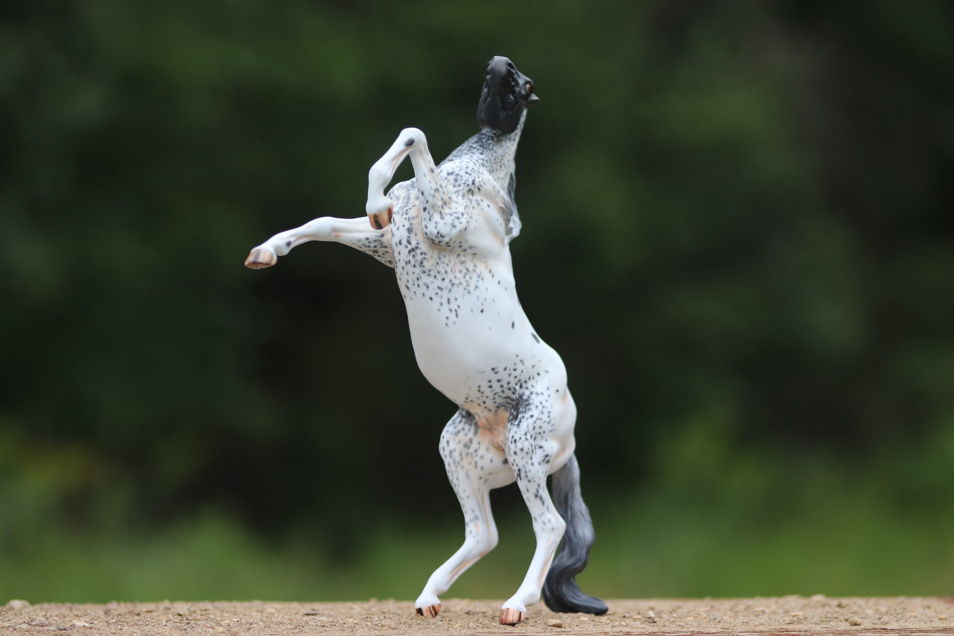 Custom Breyer classic scale rearing mustang. This guy is painted a beautiful appaloosa. He has lots of spots and mapping around his spots. He has individual hair details on his face and neck. He has beautiful detailed eyes and hooves! His eyes, nostril, and hooves are glossed. I don't guarantee LSQ, but believe this model would show well. He is stunning!