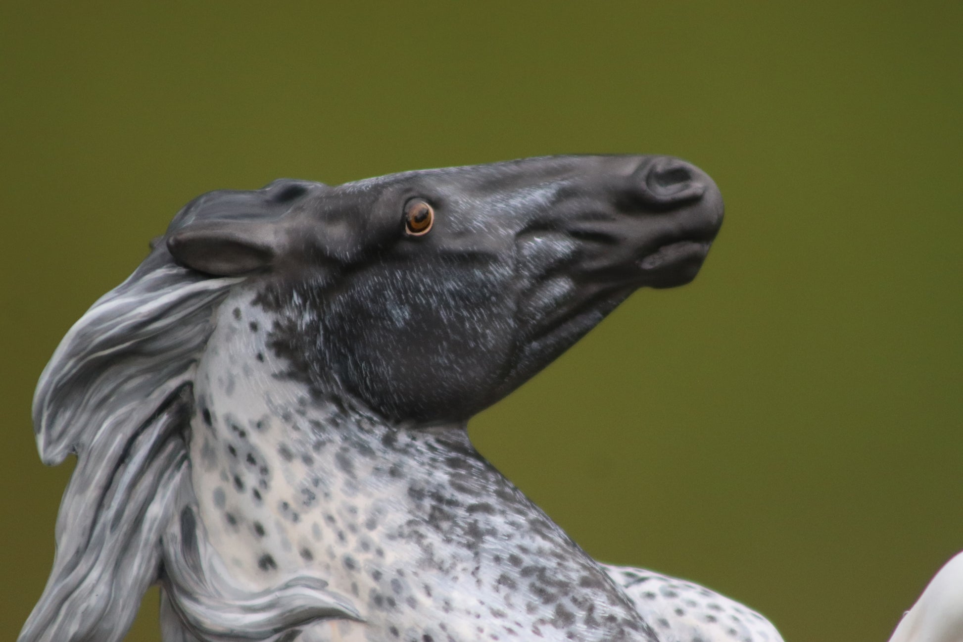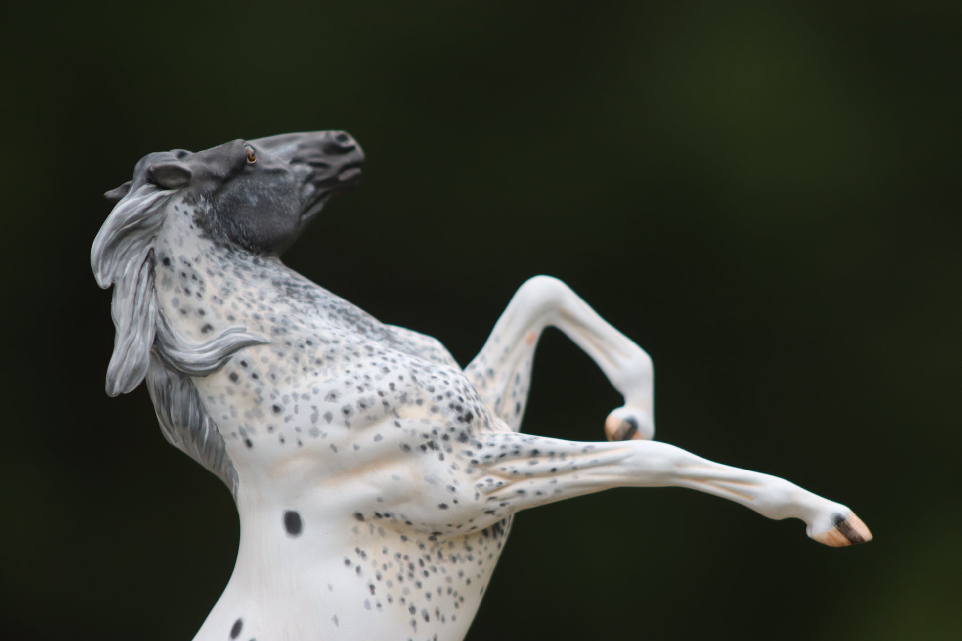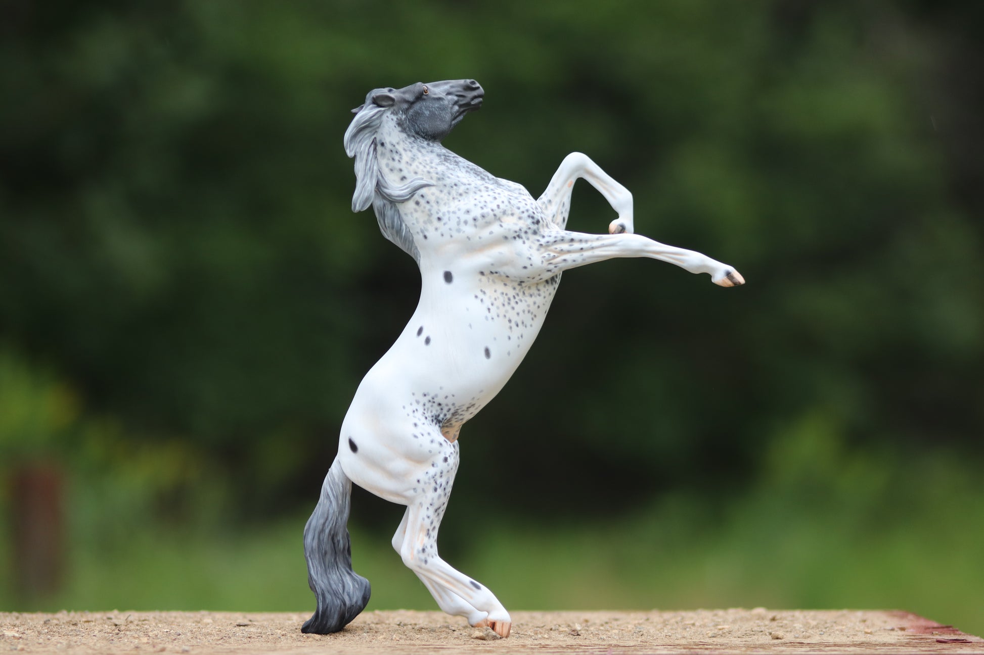 Custom Breyer classic scale rearing mustang. This guy is painted a beautiful appaloosa. He has lots of spots and mapping around his spots. He has individual hair details on his face and neck. He has beautiful detailed eyes and hooves! His eyes, nostril, and hooves are glossed. I don't guarantee LSQ, but believe this model would show well. He is stunning!