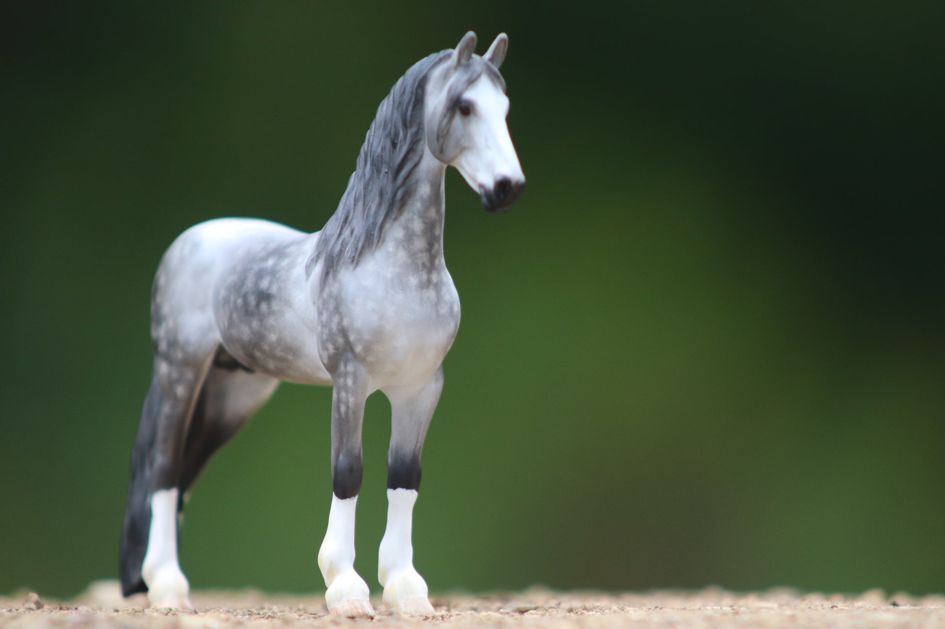 Stunning custom dapple grey Django Stablemate. This guy has been painted using pan pastels and acrylics. He has stunning shading and dapples. He also has four high white socks. His eyes, nostrils, and hooves are glossed.