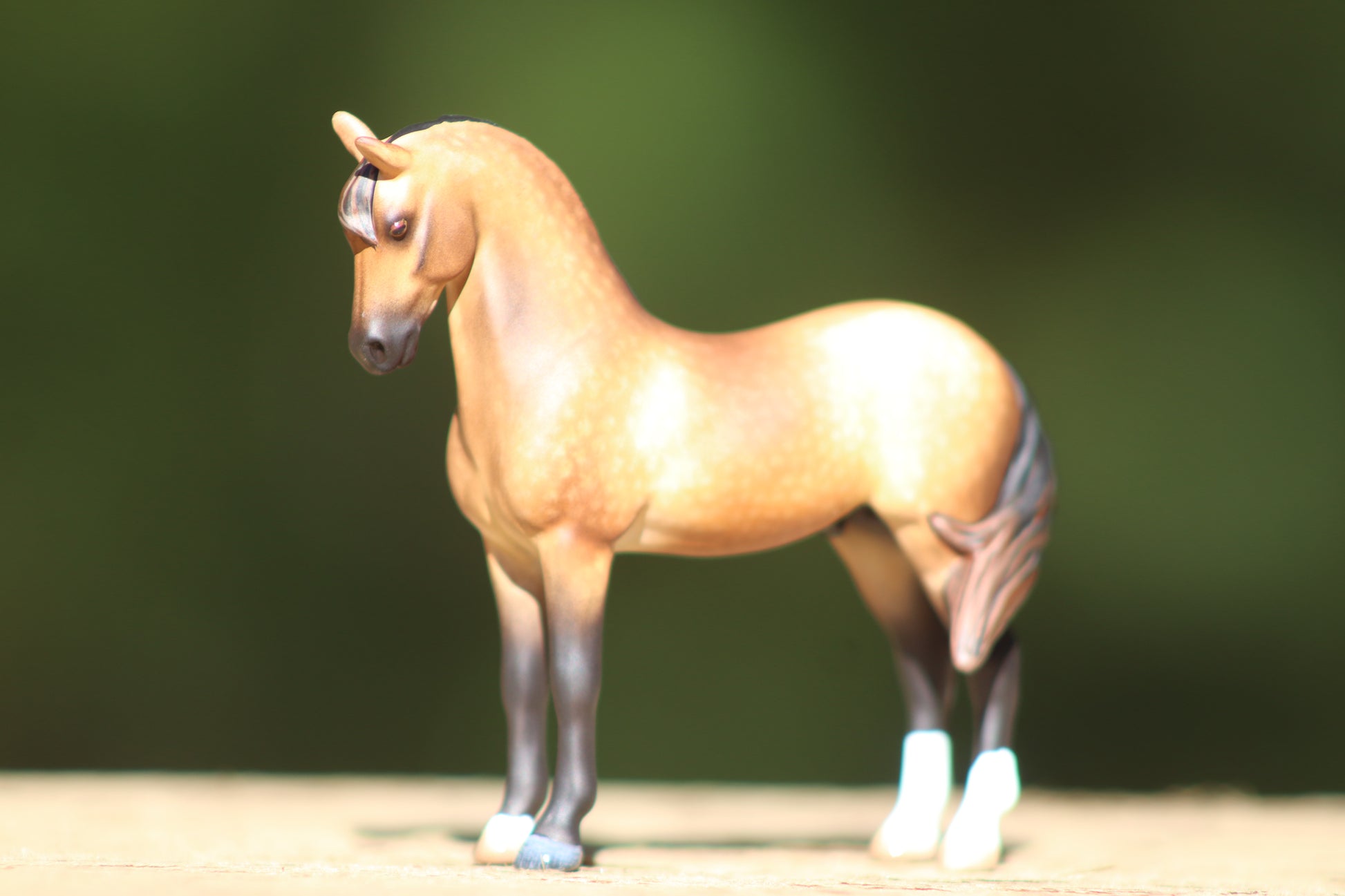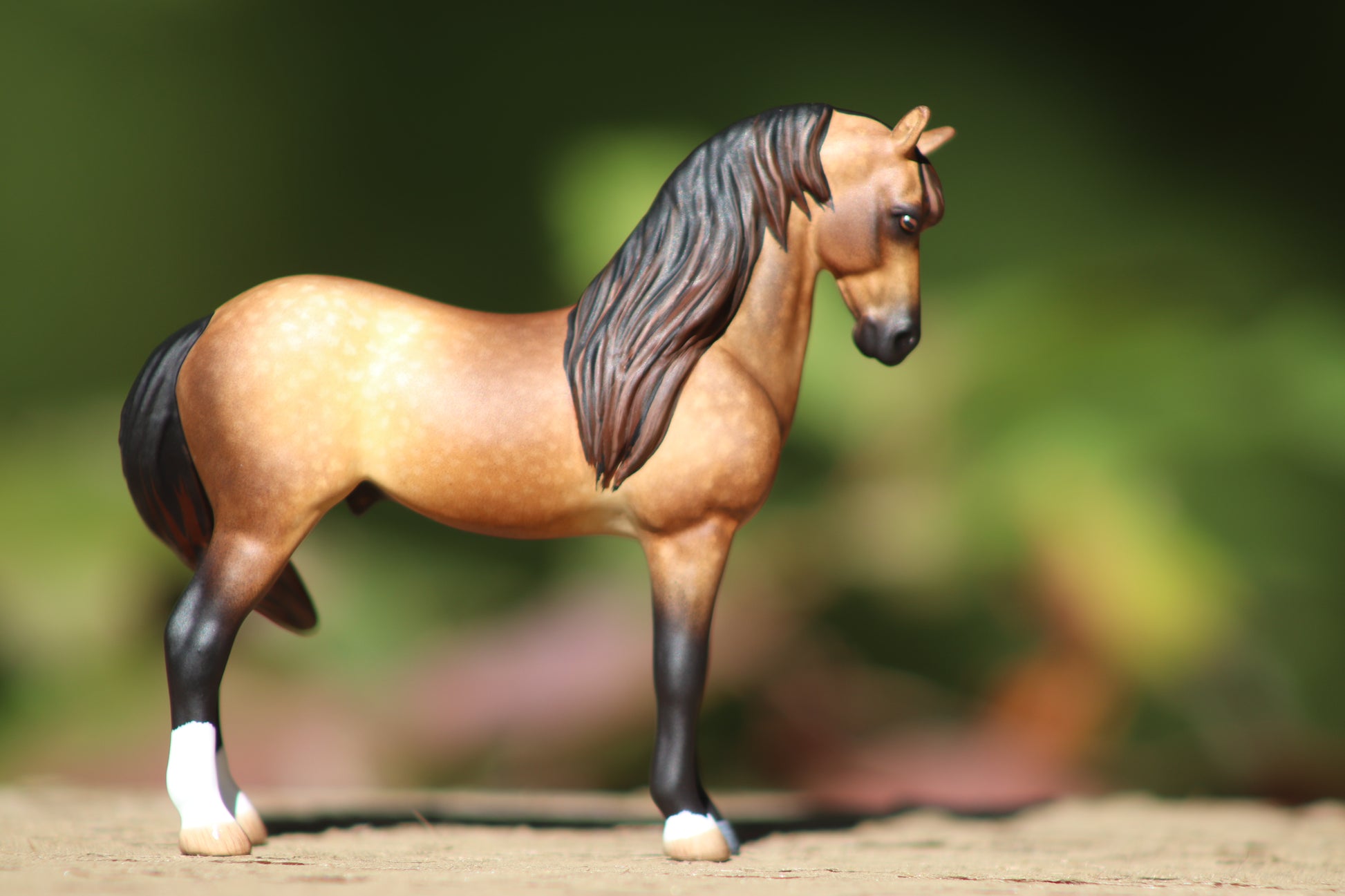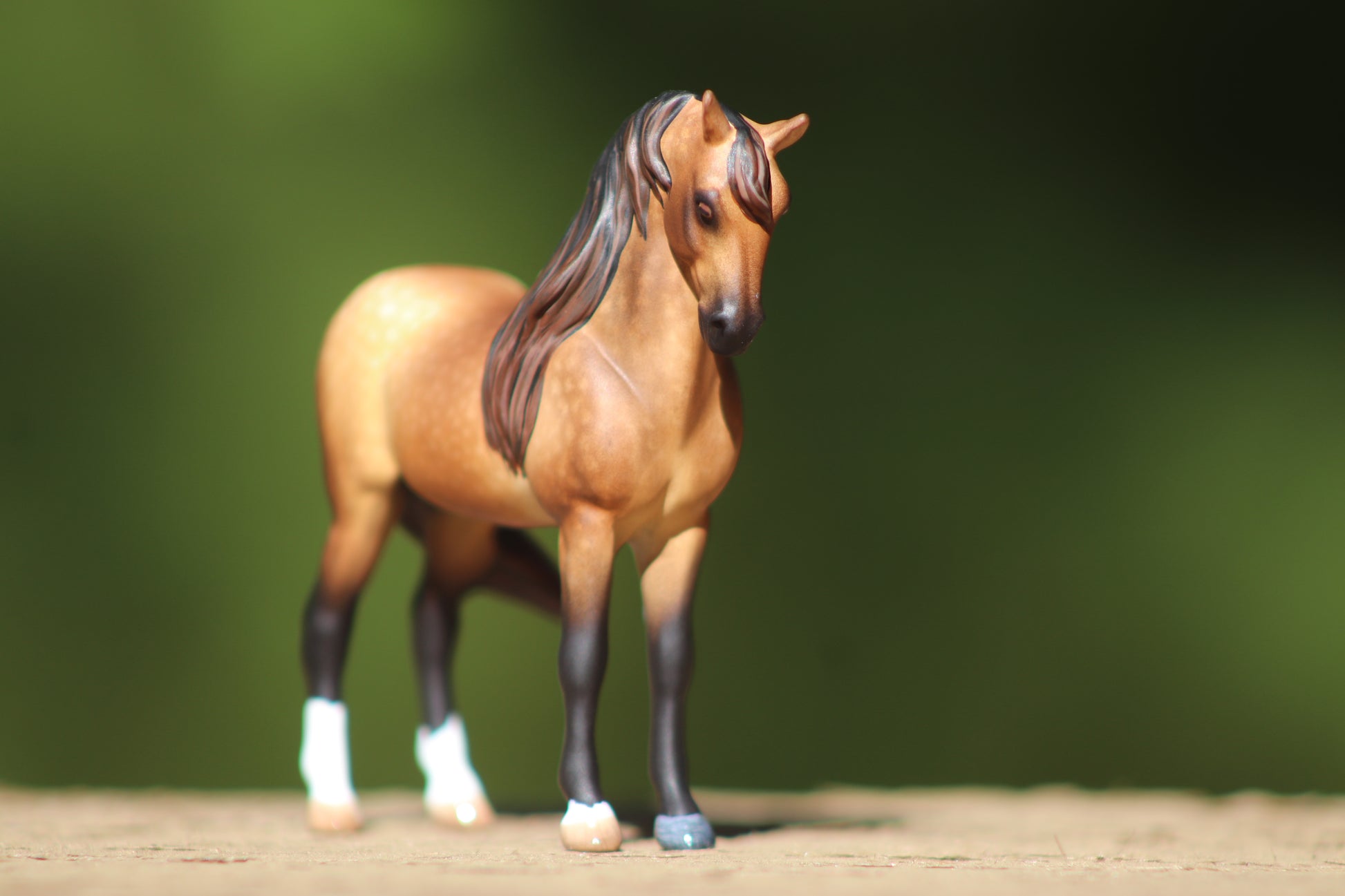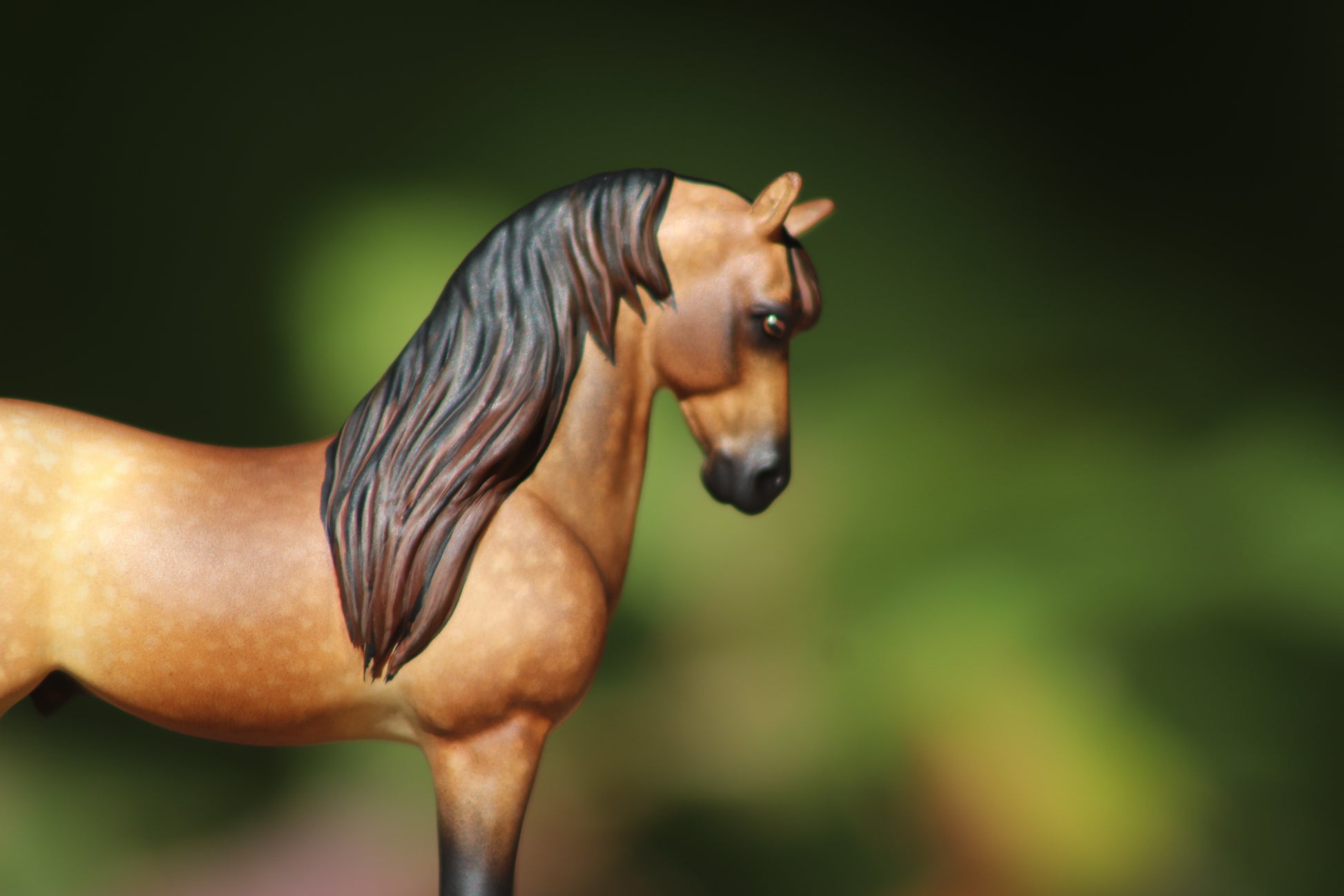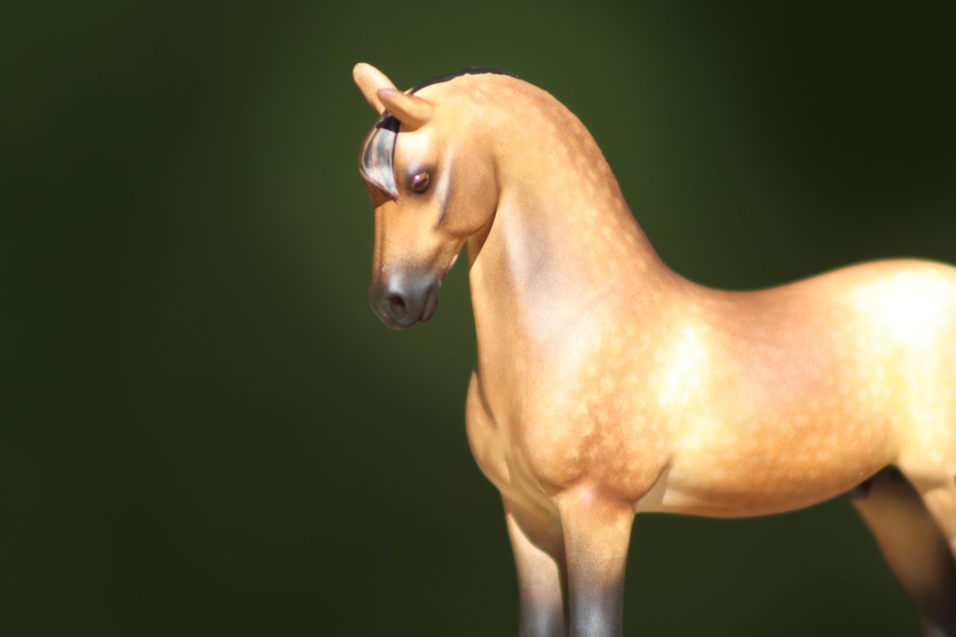 Custom Breyer Stablemate Kit with a Cantering Morgan head and neck. He has some added length to his mane. He has been painted a beautiful dappled sooty buckskin. His mane and tail is loaded with shading. He is finished with several layers of matte clear coat. His eyes, nostrils, and hooves are glossed. This little Morgan is stunning!