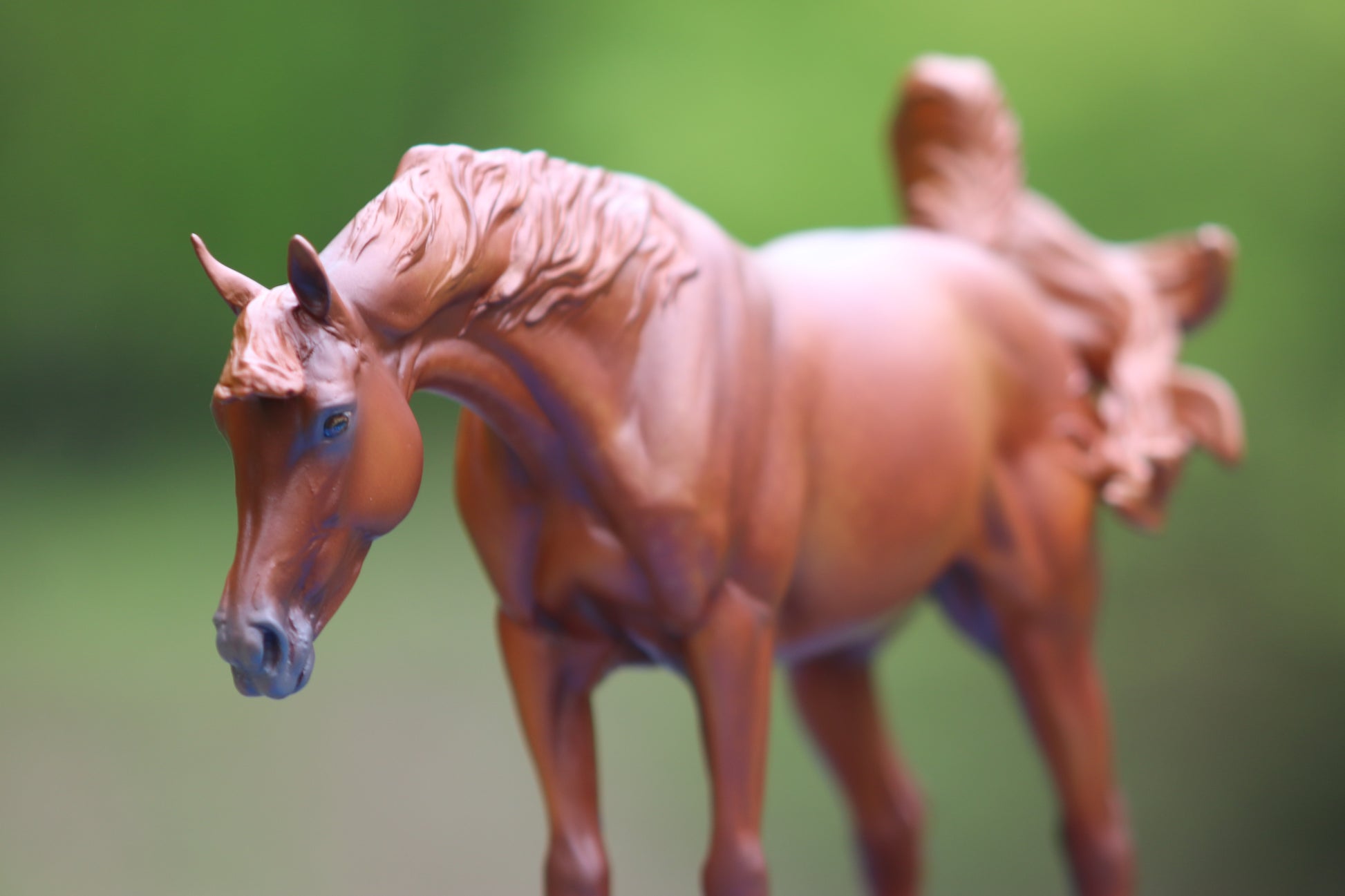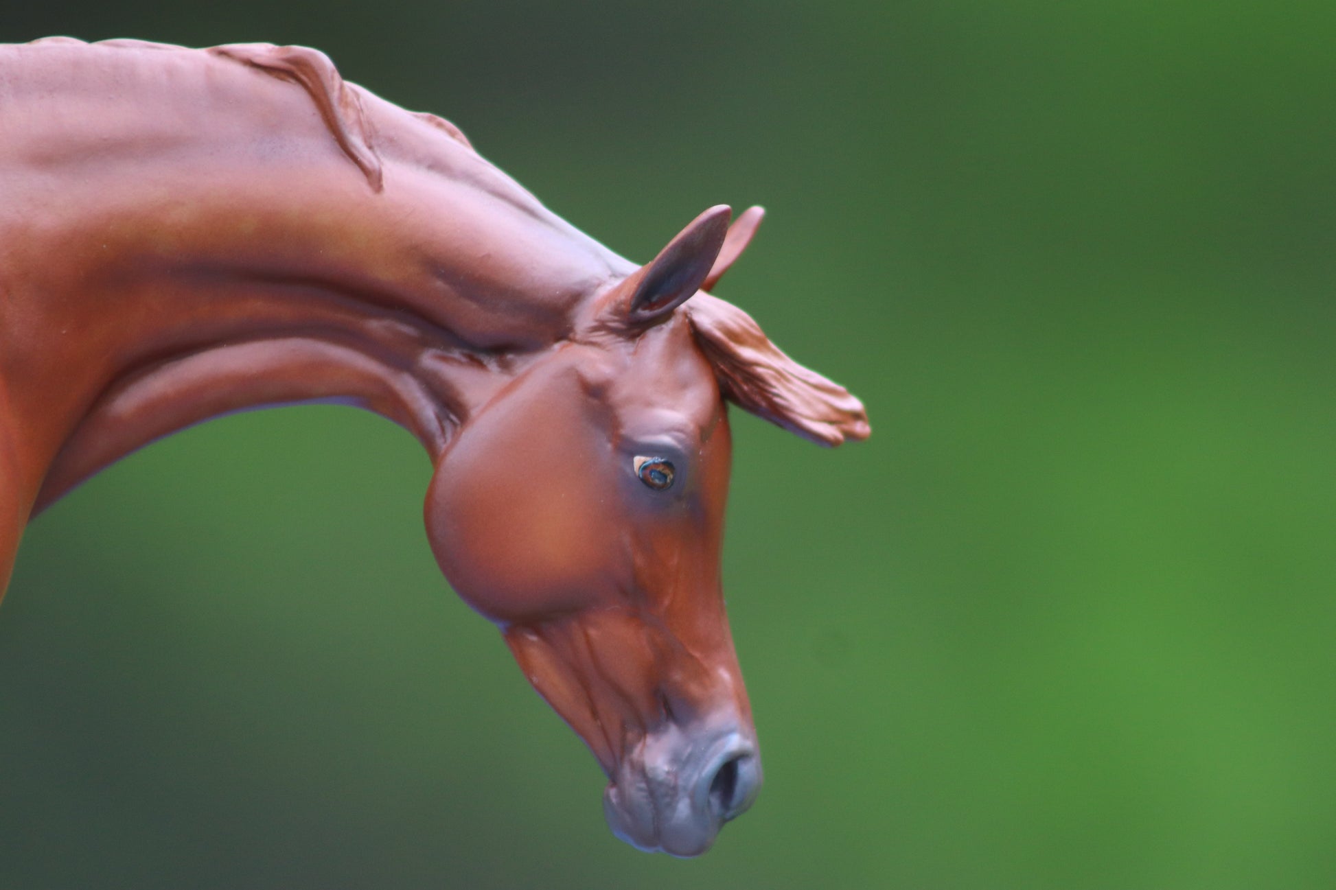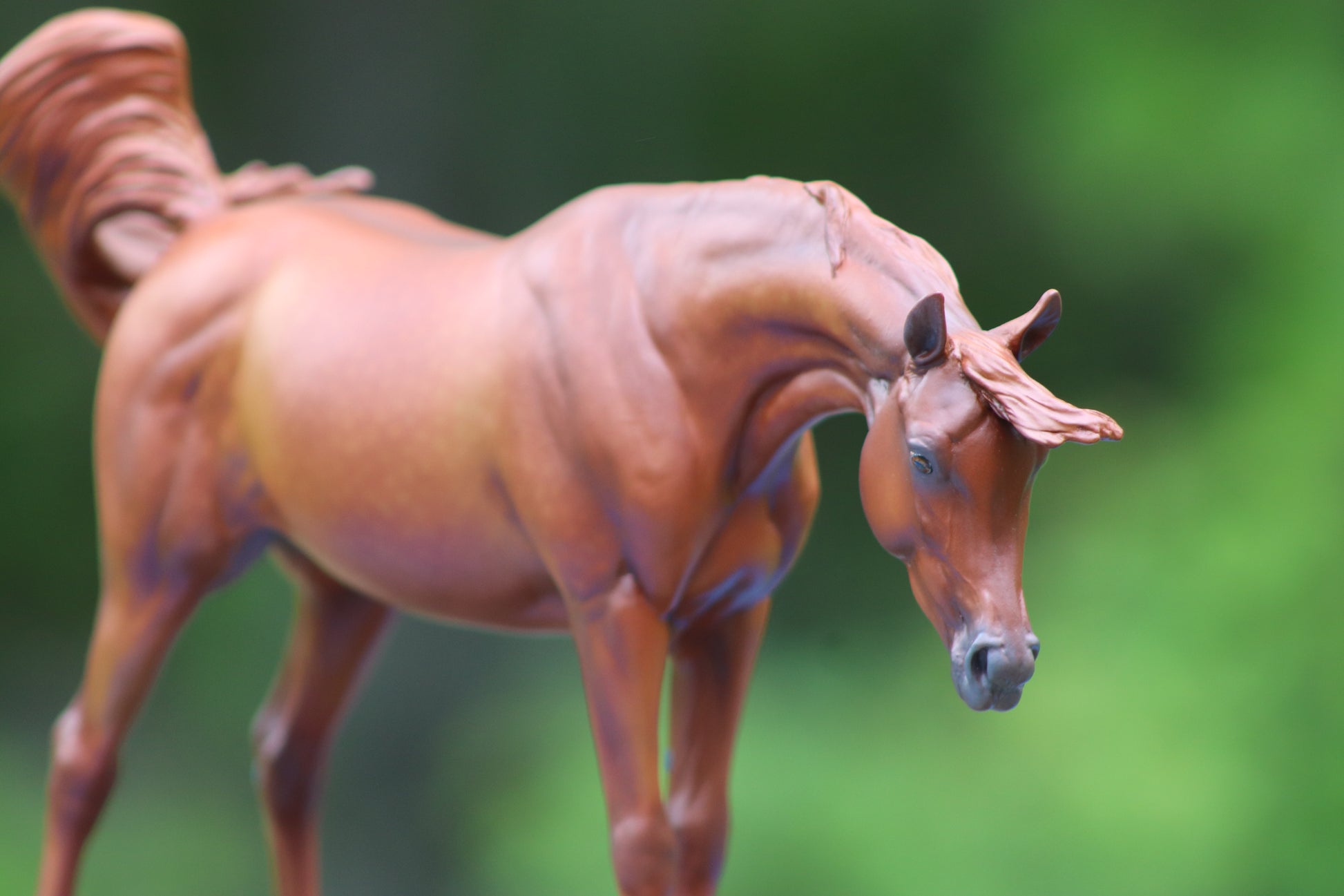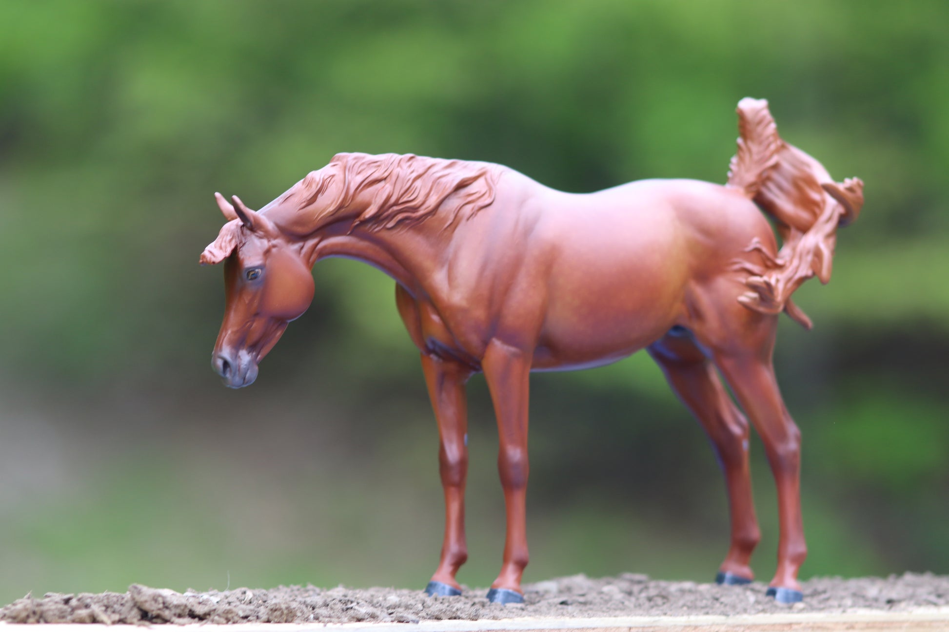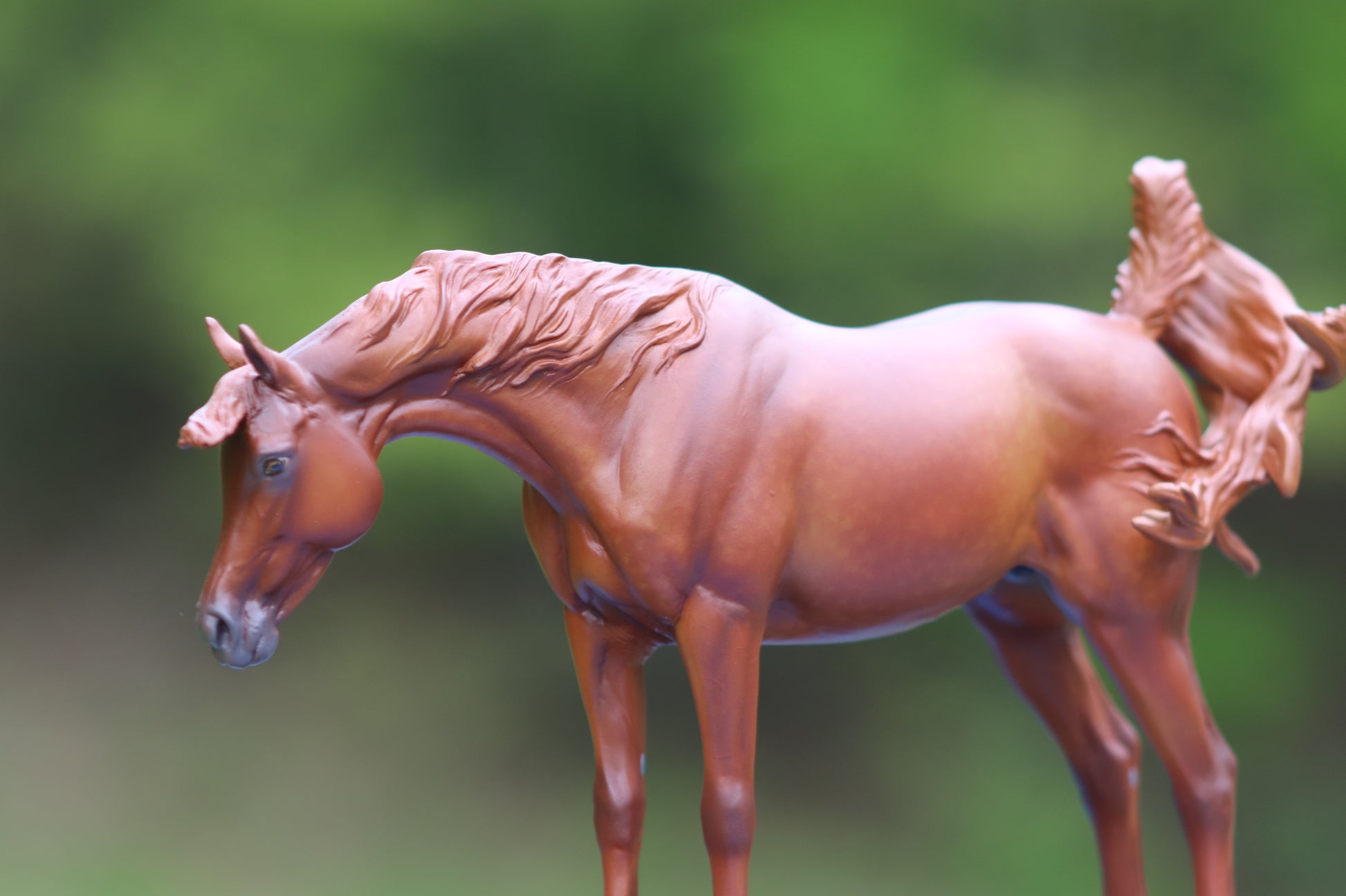 Painted traditional scale Wycked Wynd resin sculped by Morgen Kilbourn. This guy is breath taking! He is painted a rich chestnut with lots of shading and stunning dapples. His eyes, nostrils, and hooves are glossed. I personally would consider him LSQ, his finish work is top notch and his paint job is so smooth.
